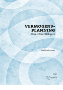 | Vermogensplanning. Een referentiekader Boek Dit beknopte handboek Vermogensplanning reikt de lezer een zeer concreet, en direct bruikbaar, referentiekader aan bij het uitdenken en uitwerken van een vermogensplanning voor vermogende particulieren. Dit referentiekader is gebaseerd op meer dan dertig jaar praktijkervaring inzake vermogensplanning, en academische werkzaamheid in de fiscaliteit, van de auteur en wordt door hem ook dagelijks aangewend. De verschillende dimensies van een vermogensplanning komen op een concreet toepasbare wijze aan bod: planning inzake de inkomstenbelasting, de organisatie van de overgang naar een volgende generatie, de organisatie van het behoud van inkomsten voor en controle door de schenkende generatie. 2025 Axel Haelterman | €36 | |